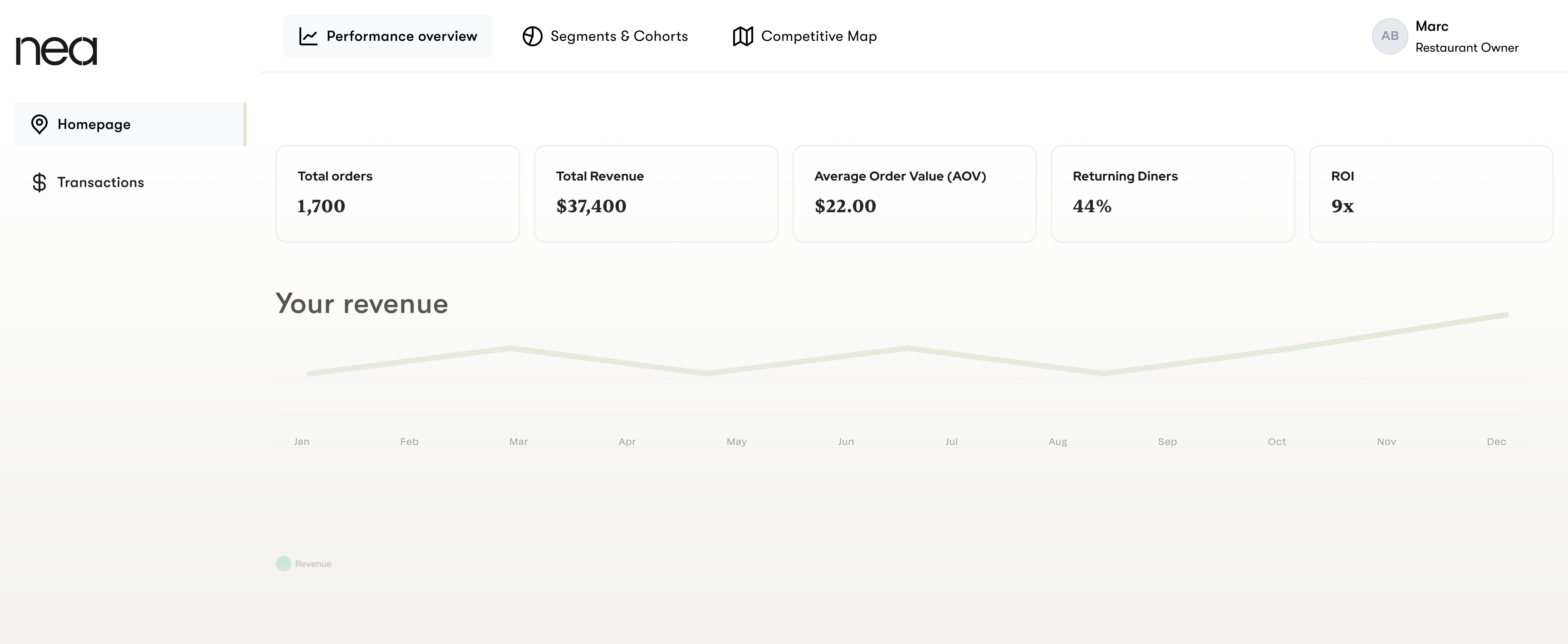 Whether you're a restaurant, cafe, or anything in between, Nea connects you with the right diners. We drive intentional visits that translate into healthier margins and real revenue, by targetting the best customer for you.